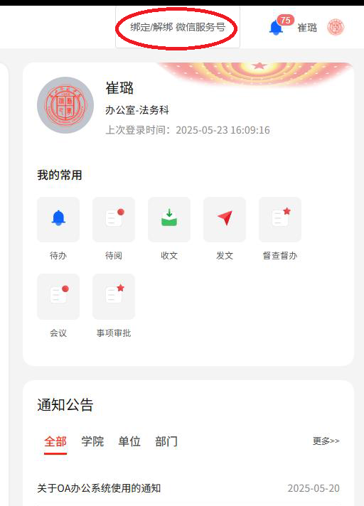 校内各单位:为更好实现OA 办公系统待办、待阅消息提示功能,请各位老师绑定微信服务号。绑定方式有如下两种:方法一:点击网页版OA 办公系统主页面右上角的服务号按钮,微信扫描弹出的二维码进行绑定;
