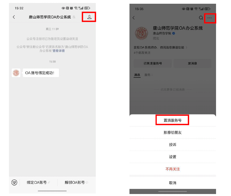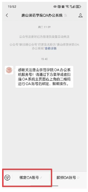 方法二:搜索“唐山师范学院OA 办公系统”服务号,关注后点击下方的菜单,在页面中输入账号和密码进行绑定;